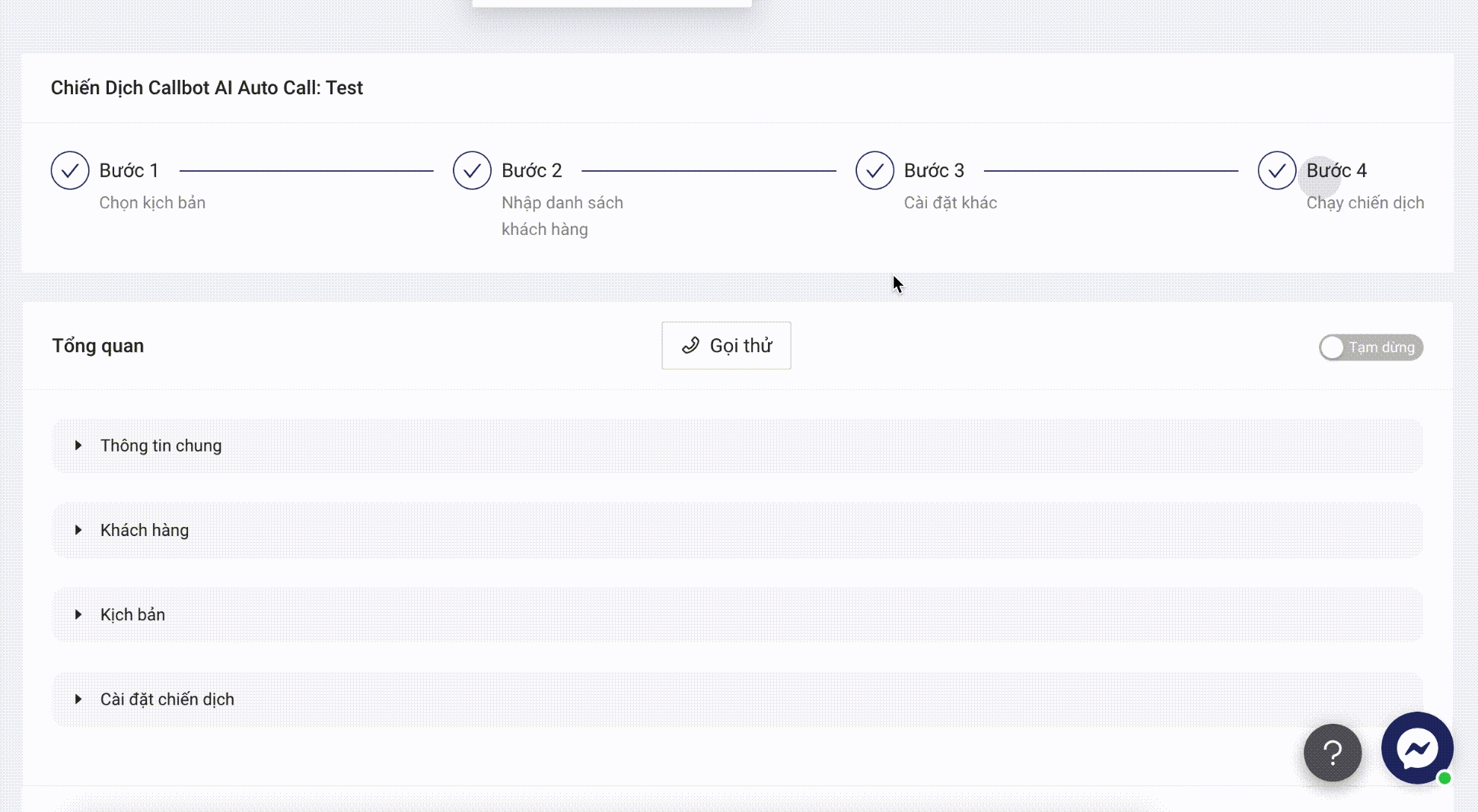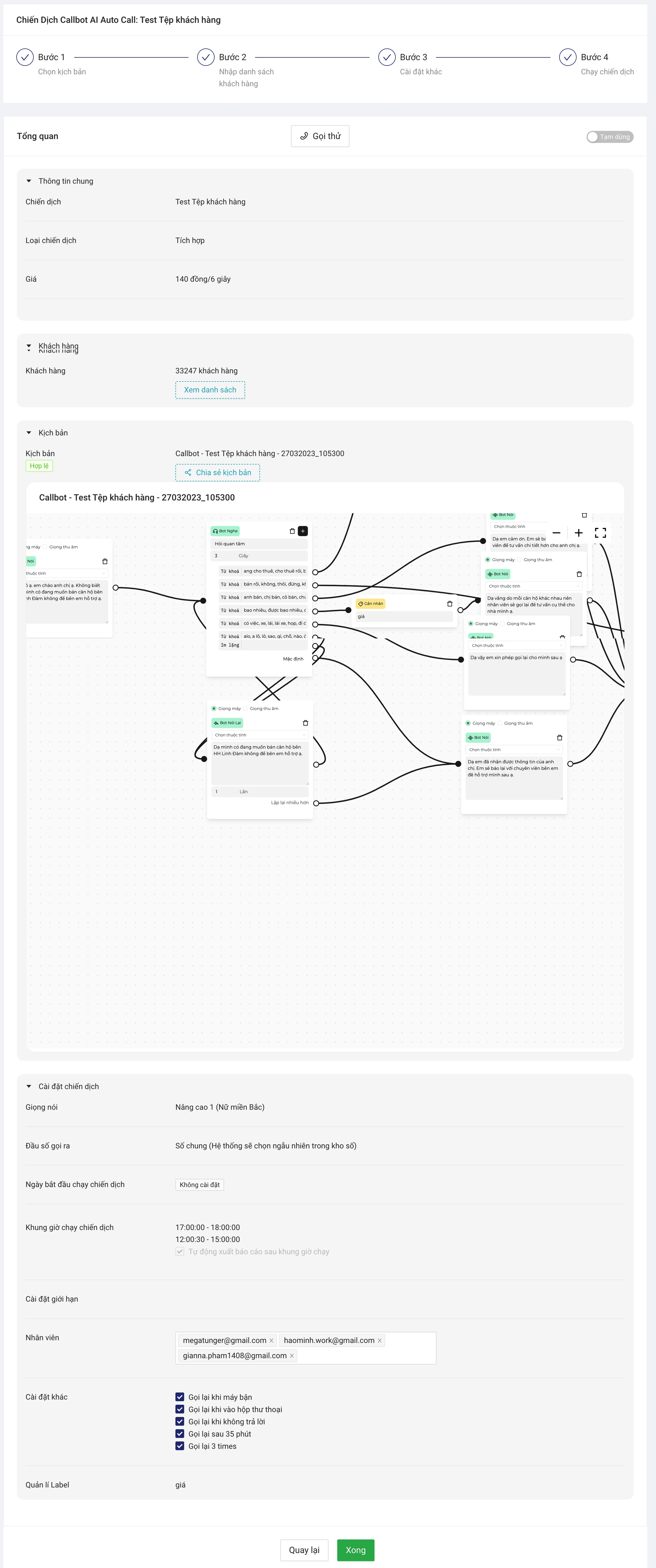 Sau khi đã cài đặt xong hết các thông tin của chiến dịch. Bạn hãy kiểm tra lại các thông tin một lần nữa, tạo cuộc gọi demo để chắc chắn kịch bản đã phù hợp rồi chạy chiến dịch.