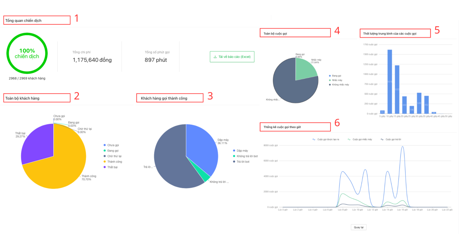 Biểu đồ gọi khách hàng thành công: Biểu đồ cho chúng ta biết chất lượng của các cuộc gọi thành công. Biểu đồ phân tích chi tiết hơn các cuộc gọi khách hàng nhấc máy để biết được (1) phần trăm khách hàng dập máy giữa cuộc gọi, (2) nghe hết cuộc gọi mà không trả lời bot hay (3) nghe hết cuộc gọi và trả lời bot.