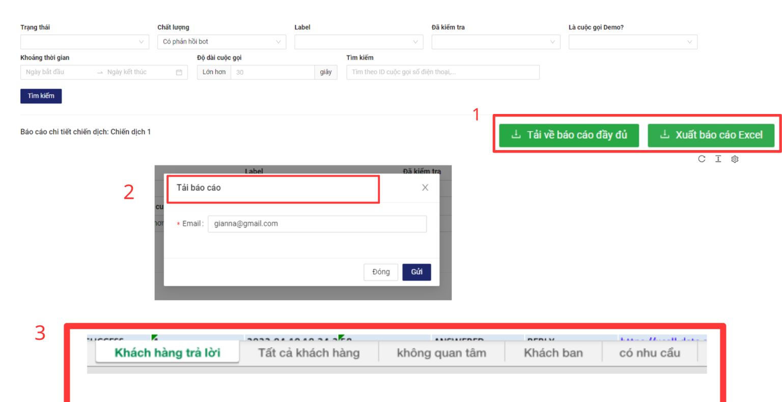 Tải báo cáo chi tiết để lấy được thông tin chi tiết từng cuộc gọi Tải báo cáo chi tiết của chiến dịch về tại nút Tải về báo cáo (Excel).
