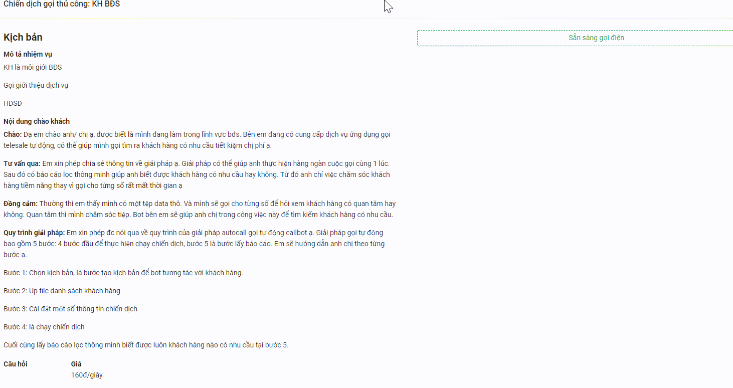 Sau khi đã rõ thông tin chiến dịch, bạn bấm nút Sẵn sàng gọi điện góc bên phải màn hình để bắt đầu gọi chào hàng. Khi này số điện thoại cần gọi đầu tiên sẽ hiện ra, bạn bấm vào số điện thoại đó để được cung cấp thêm các thông tin về họ (email, lĩnh vực, nơi chốn, địa chỉ, tên công ty,…) giúp tăng hiệu quả tương tác bán hàng.