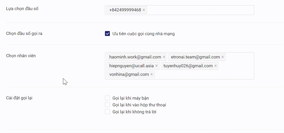 Đầu số riêng: Bạn cần liên hệ Tổng đài thông minh gọi tự động để kết nối bạn với nhà mạng để mua số của riêng bạn. Sau đó, nhà mạng và uCall sẽ kết nối kỹ thuật với nhau để có thể dùng số điện thoại đó cho việc gọi tự động.