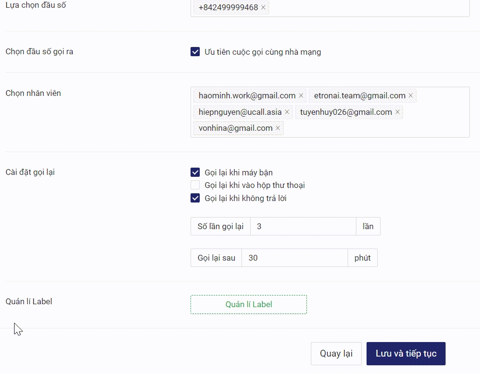Vậy là bạn đã cài đặt xong các thông tin cuộc gọi cho chiến dịch. Bấm Lưu và Tiếp tục để chuyển sang Bước 4 - Chạy chiến dịch.